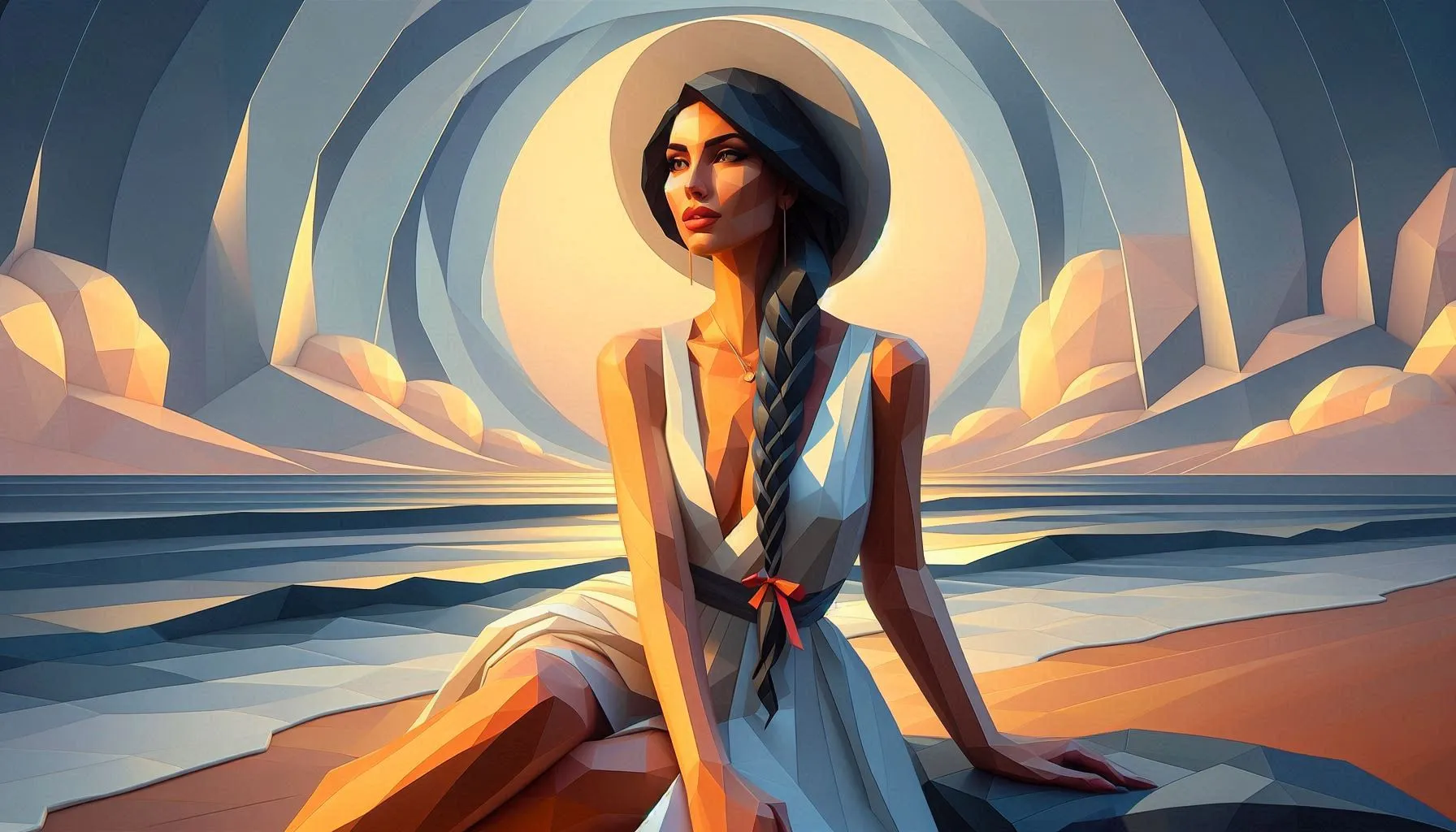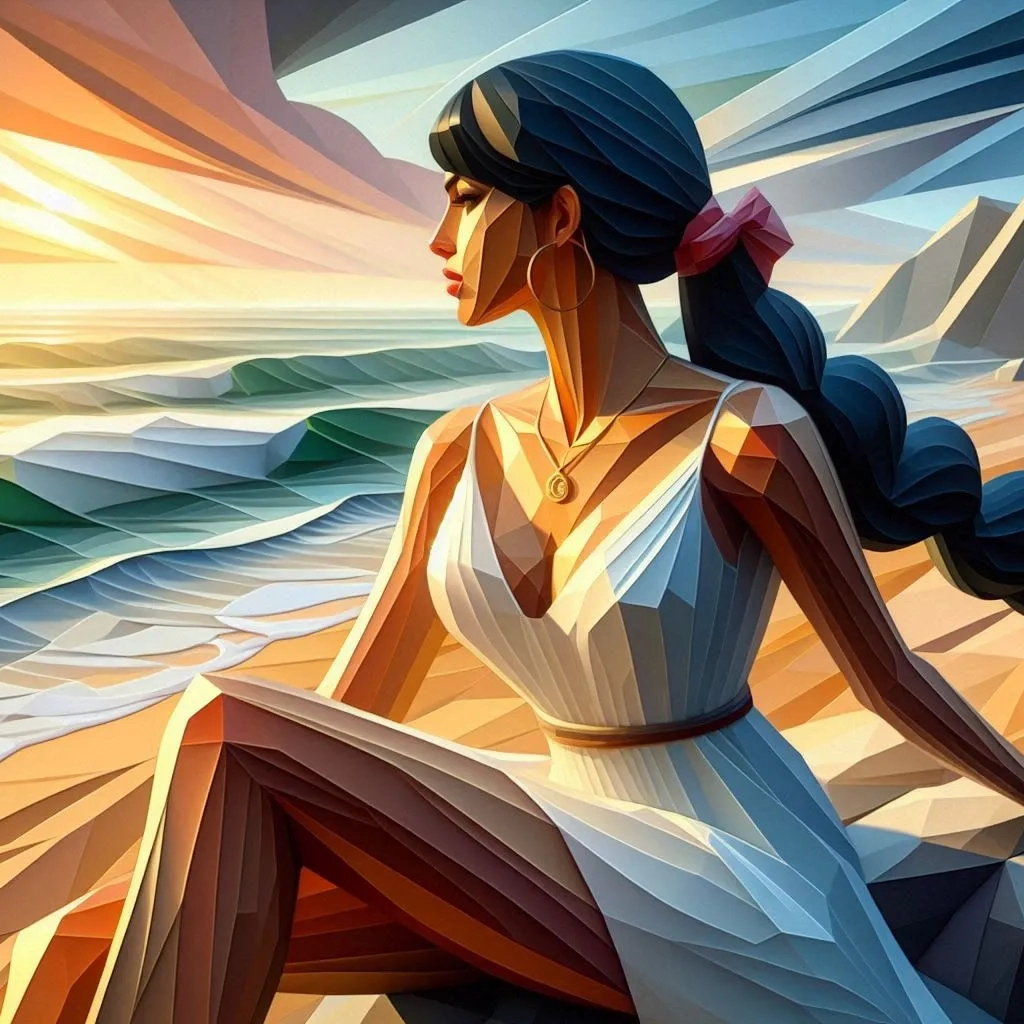 3-D art oil on canvas. A beautiful Brazilian woman in geometric abstraction. She has long black hair tied in a braid. The braid has a red bow. She is wearing a white sleeveless blouse and a delicate gold necklace. She is sitting on a rock on the beach and looking out to sea. The sun is trying to break through the clouds. Beautiful colours, abstract shapes, soft lines, elegant curves. High resolution. Painting by Lois van Baarle and Greg Rutkowski.