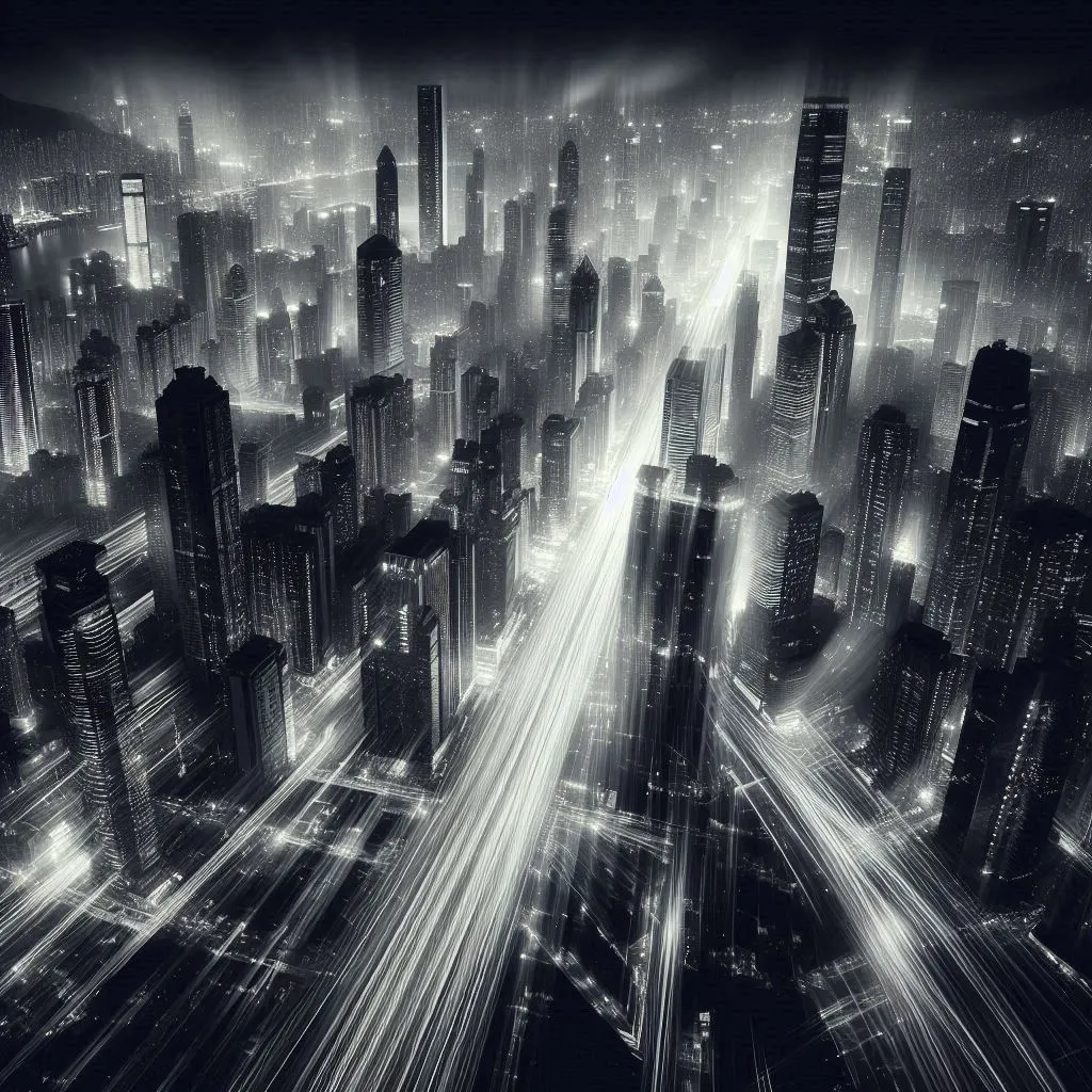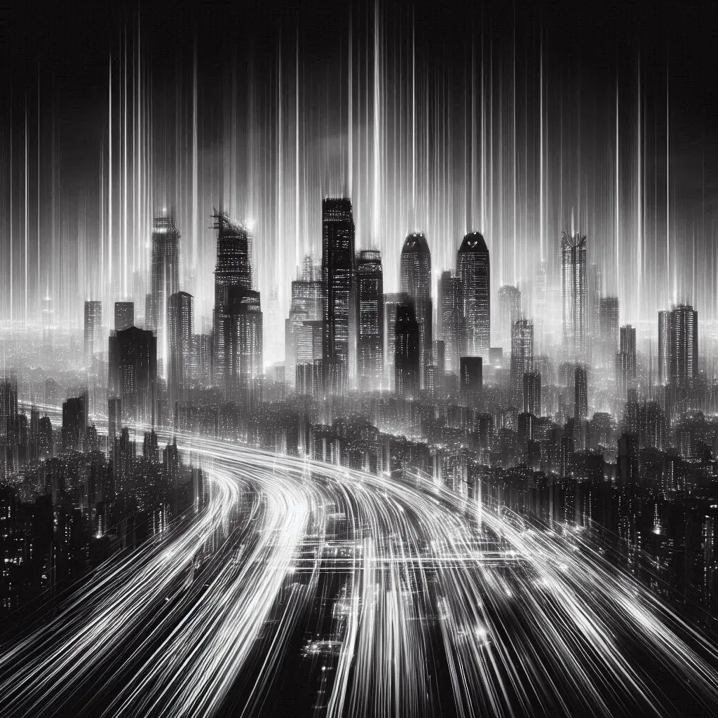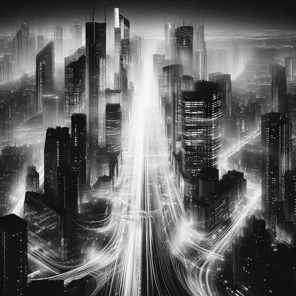 8K digital photo Immersed in monochromatic brilliance, this long-exposure photograph transforms the nighttime landscape of (city) into a mesmerizing urban symphony. Shadows and luminescence dance across the cityscape, revealing the pulse of the metropolis through calculated streaks of light and intricate architectural silhouettes. The black and white medium enhances the dramatic essence of the scene, capturing the ethereal quality of movement and urban dynamism. Blur