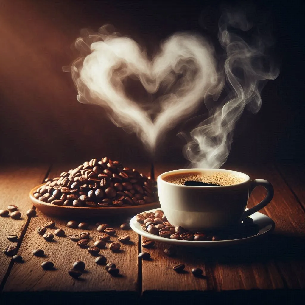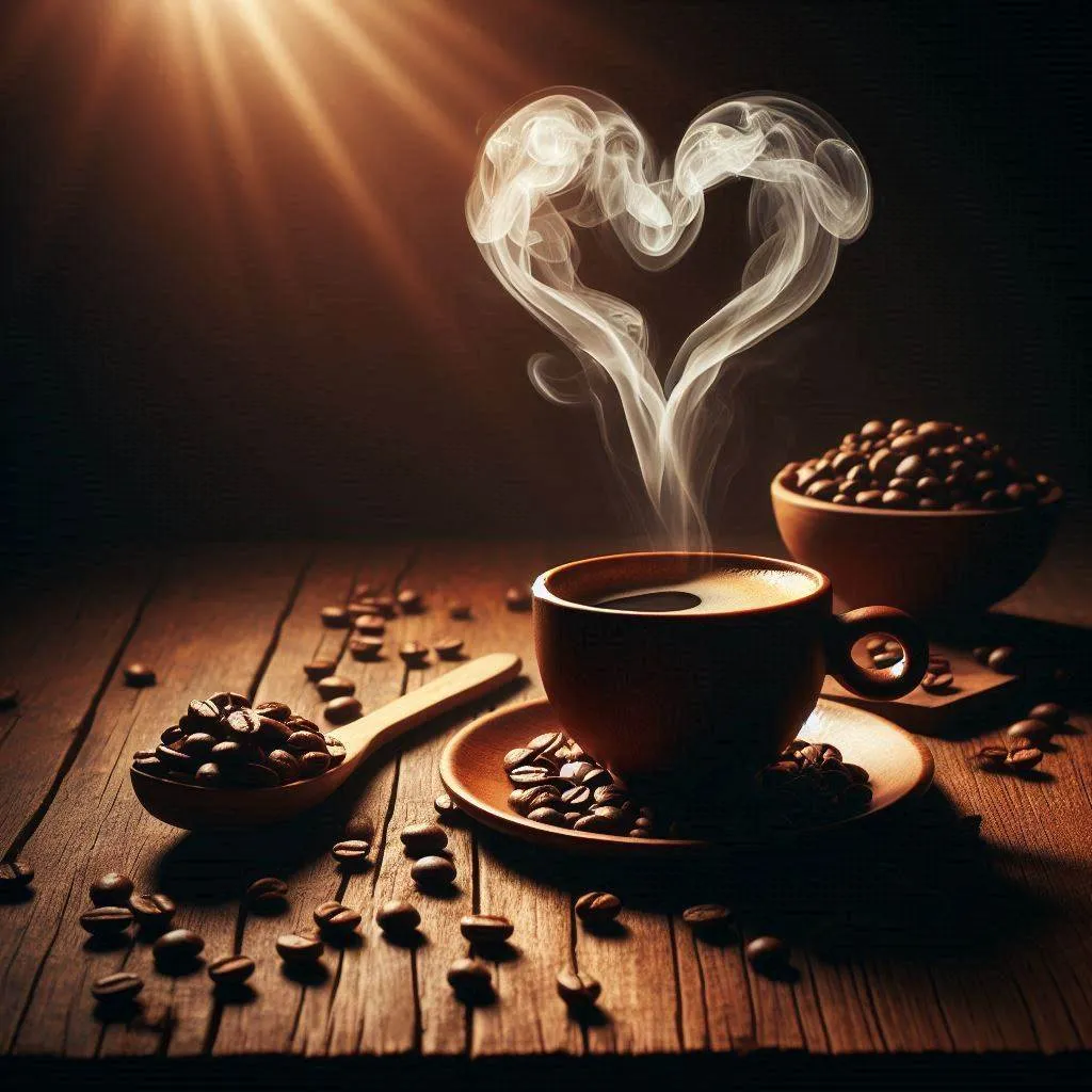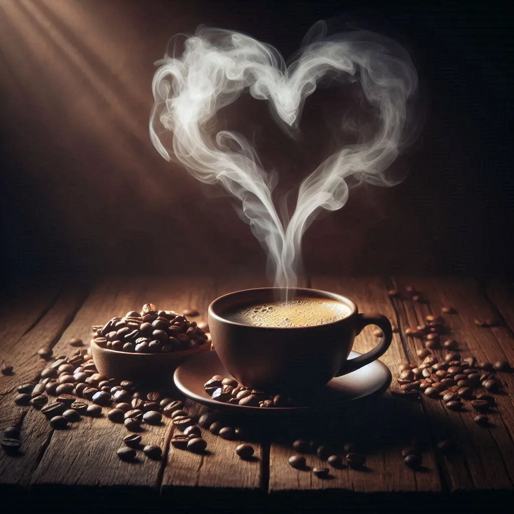 wooden table with coffee beans on the table, a steaming cup of coffee, the smoke forms a heart, all in warm dark lighting and the backgroud is dark