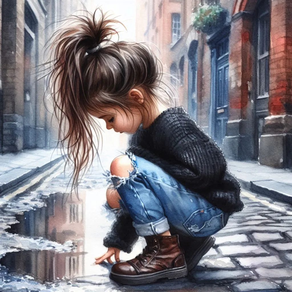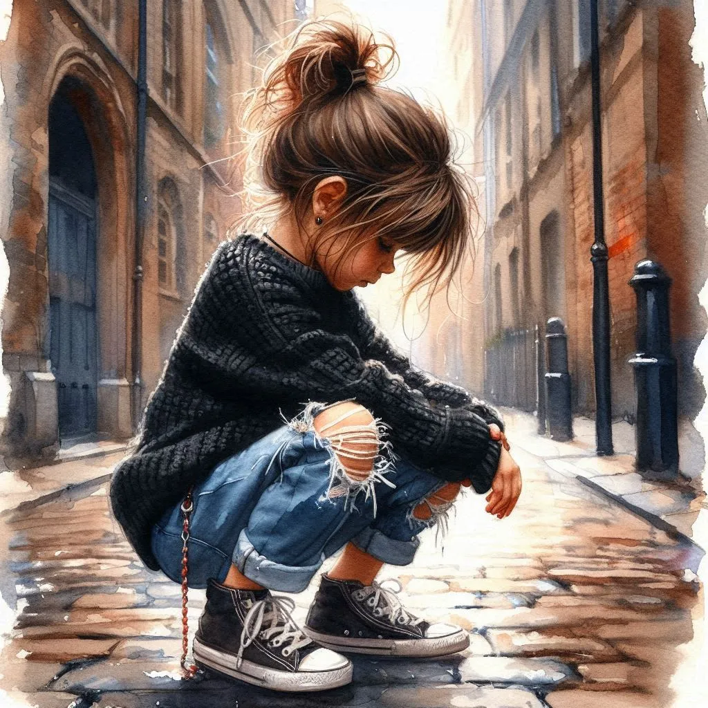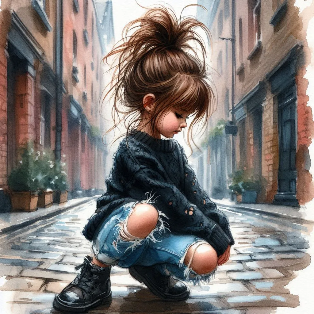 A little girl with a brown messy ponytail, kneels down, she is wearing ripped jeans with holes and a black sweater, she is in an alley in London, watercolor, oil painting