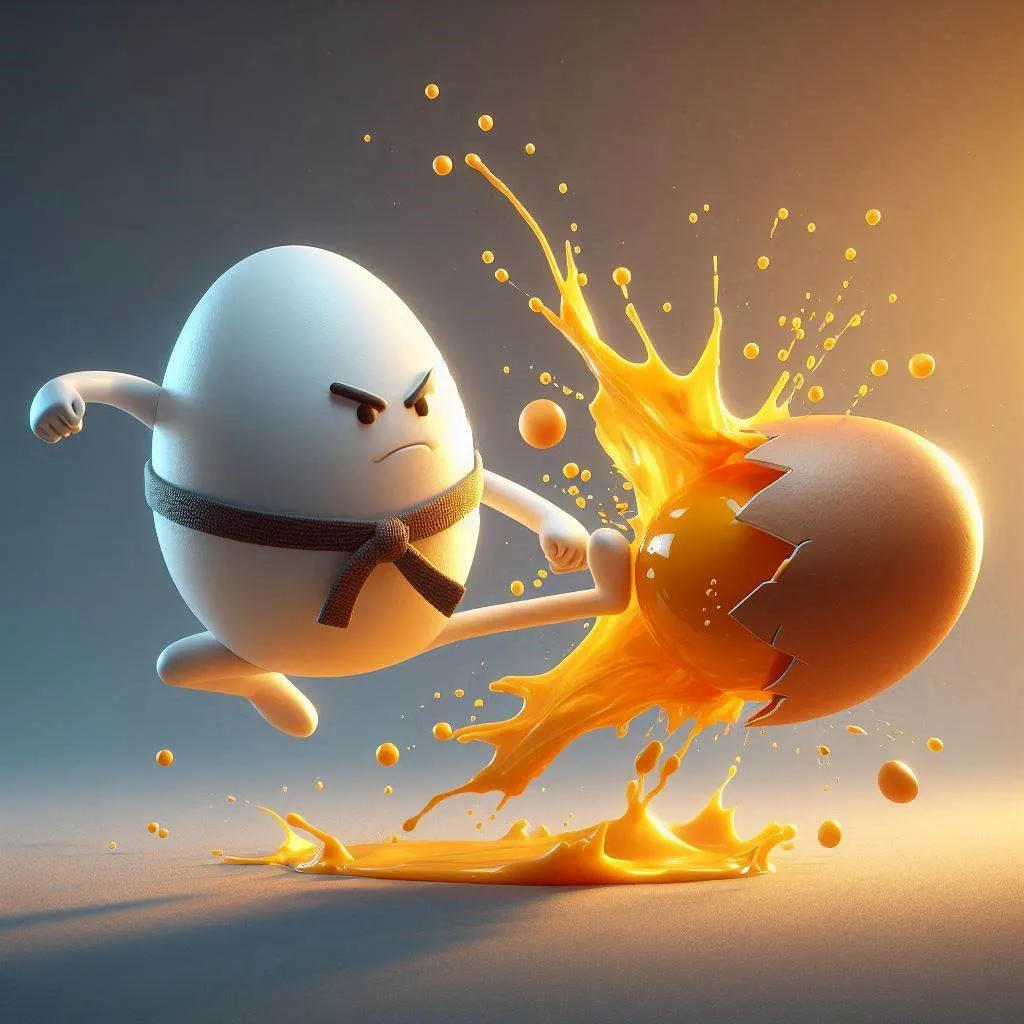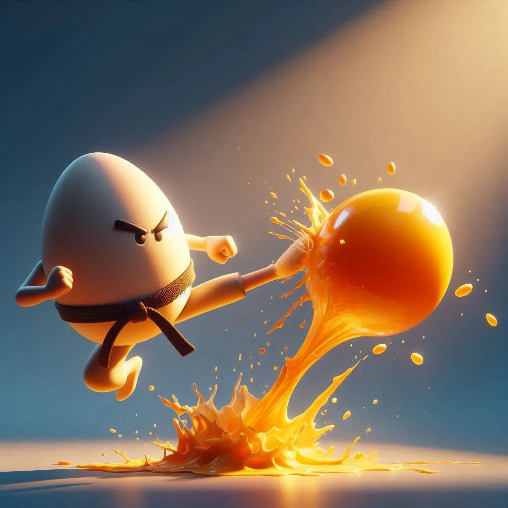 A digital artwork portraying a fight between two anthropomorphic eggs in Pixar style. Golden hour lighting creates a warm, inviting atmosphere. An egg in a karate belt performs a flying kick. Another egg explodes, spraying golden yolk. The background is a smooth gray to blue gradient. The image emphasizes detail and contrasts.